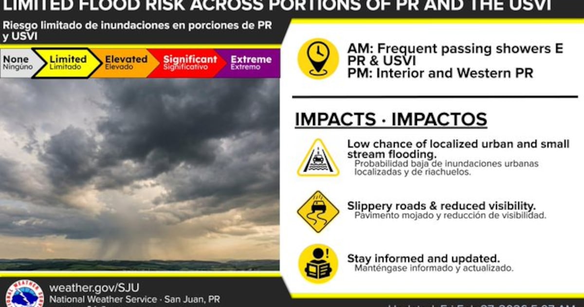 El viento soplará con fuerza del este y traerá aguaceros rápidos hasta el domingo. Aunque muchas lluvias se moverán con rapidez, en algunos momentos caerán aguaceros fuertes, especialmente en el este de Puerto Rico