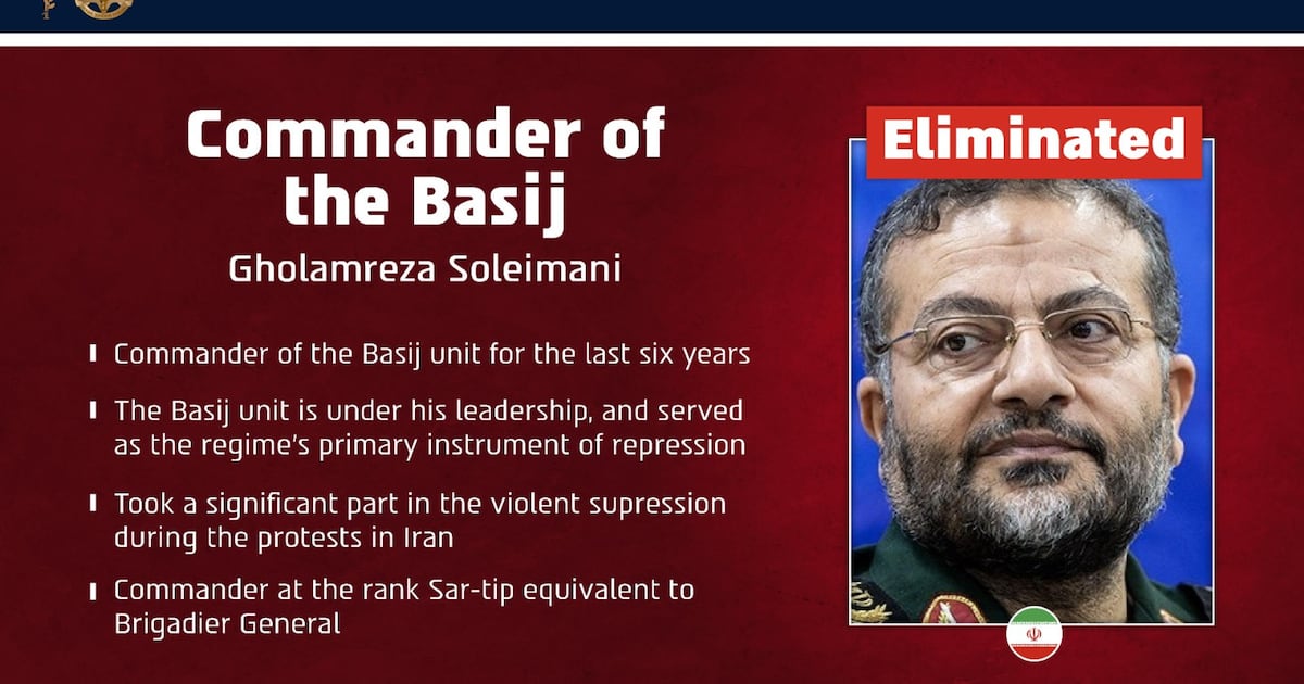 La Guardia Revolucionaria iraní confirmó este martes la muerte de Gholamreza Soleimani, comandante de la milicia paramilitar Basij (encargada de la represión ciudadana y vinculada a la Guardia) en los bombardeos, según informaron agencias oficiales.