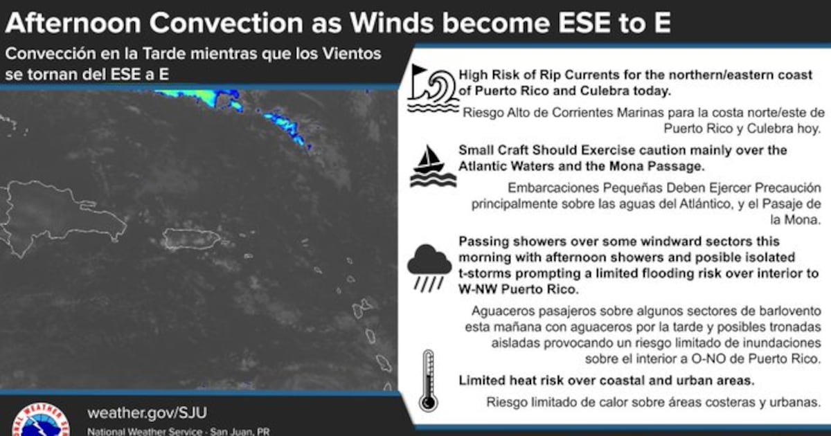 Se esperan aguaceros pasajeros en zonas del este durante la noche y la mañana. En la tarde, la lluvia se desarrollará principalmente en el interior y el noroeste de Puerto Rico por efectos del calor, la brisa marina y el terreno. Hoy hay riesgo limitado de inundaciones en esas zonas, y el sábado se repite ese escenario. El viernes será el día con menos lluvia.