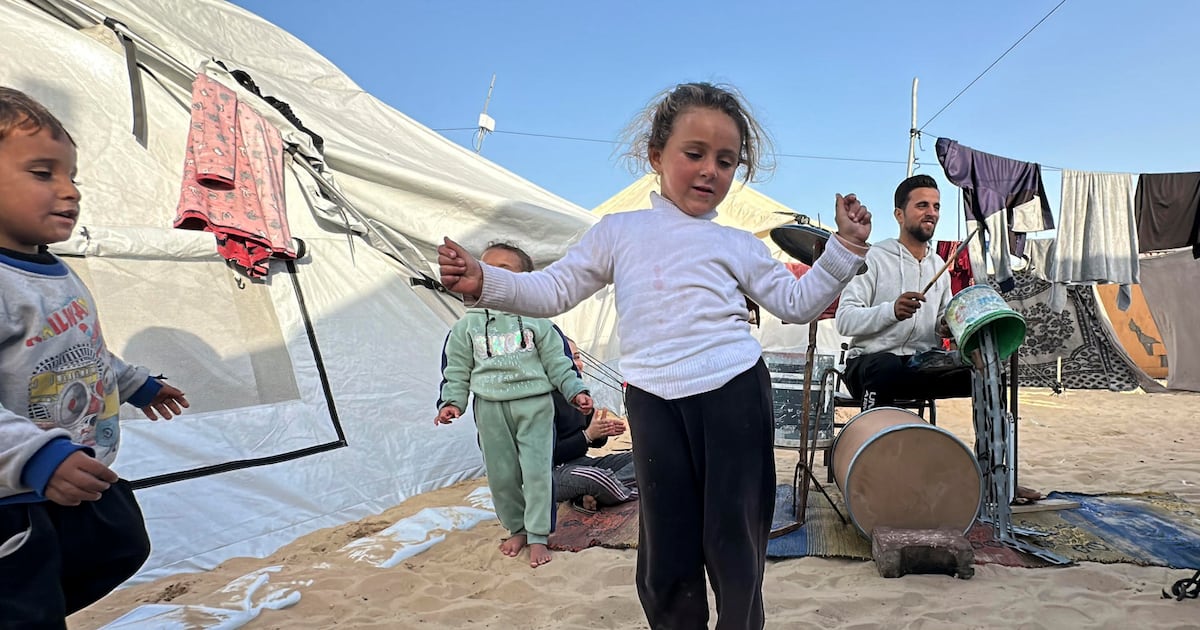 Una batería con cubos de plástico: la terapia de un músico gazatí en medio de la miseria